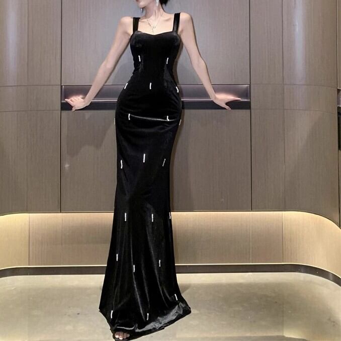 ロングドレス ワンピース レディース 黒 スカート タイト マーメイド ノースリーブ ベルベット ベロア デザイン スクエアネック 大人 ybh2279