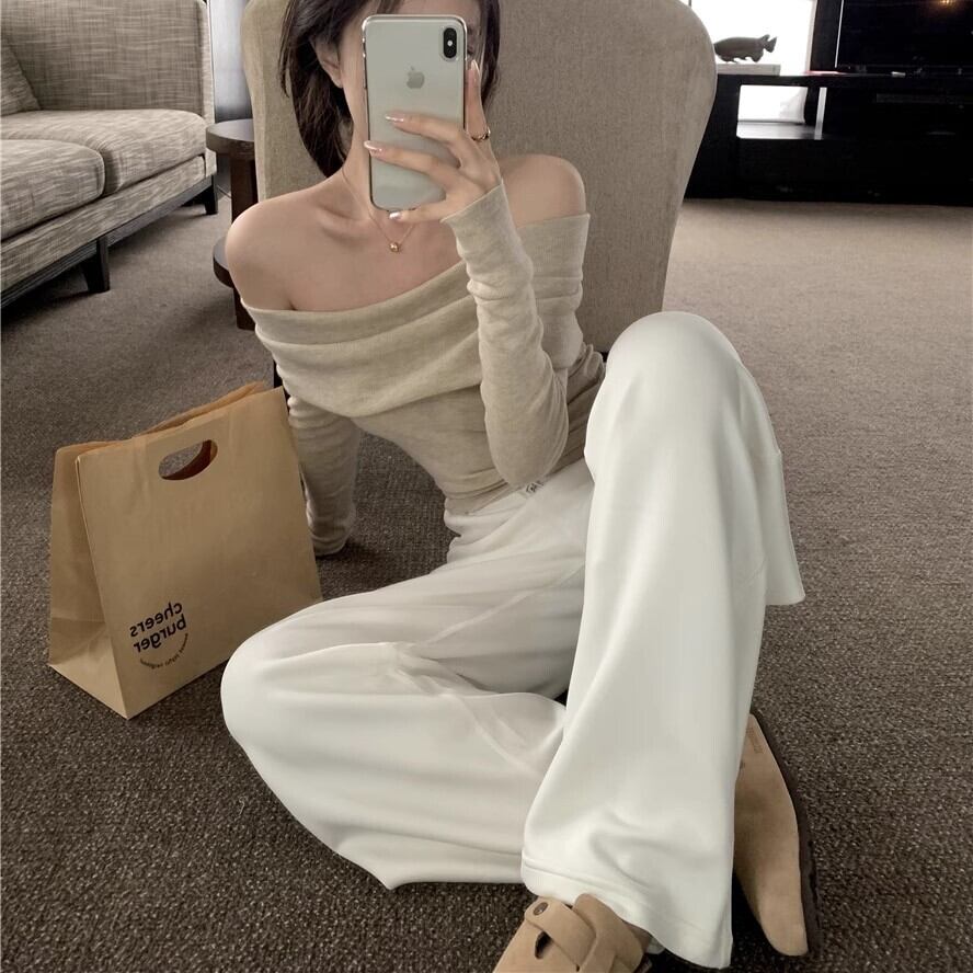 カットソー レディース トップス オフショルダー 長袖 細見え セクシー 大人 春 秋 無地 シンプル ニット タイトシルエット ybh2280