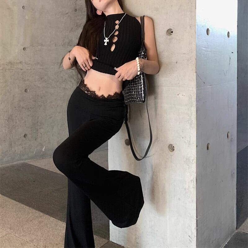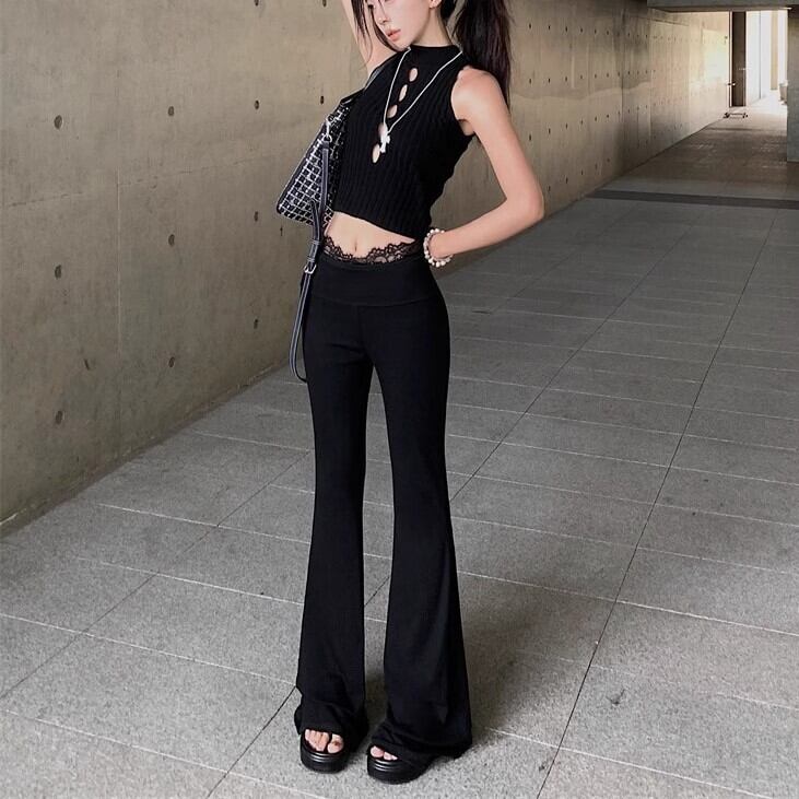 パンツ ボトムス レディース 黒 タイト ハイウエスト レース デザイン ワイド フレアパンツ 無地 足長効果 ブーツカット 細見え きれいめ 大人 ybh2287