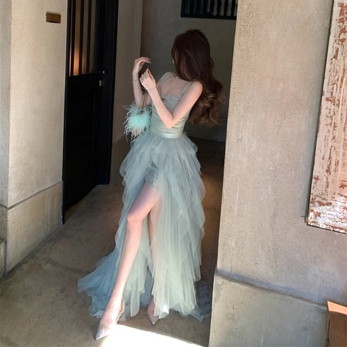 ドレス ロング レディース ブライダル チュール ふわふわ パステル ノースリーブ かわいい 2way リボン スクエアネック ワンピース スカート ybh2289